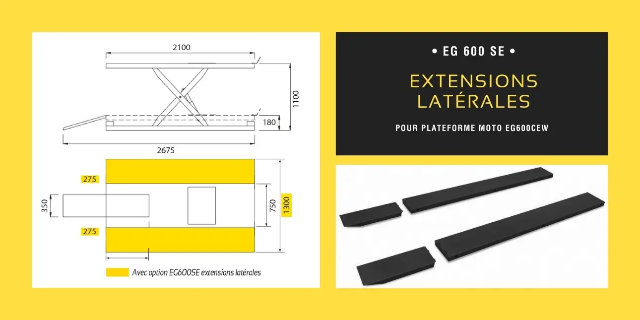 Cette table élévatrice s'adapte aux véhicules plus large grâce aux extensions latérales disponibles (réf. EG600SE). Cette option permet de passer d'une largeur de 750mm à 1 300mm et comprend deux rampes pour faire passer des véhicules à 2 roues.