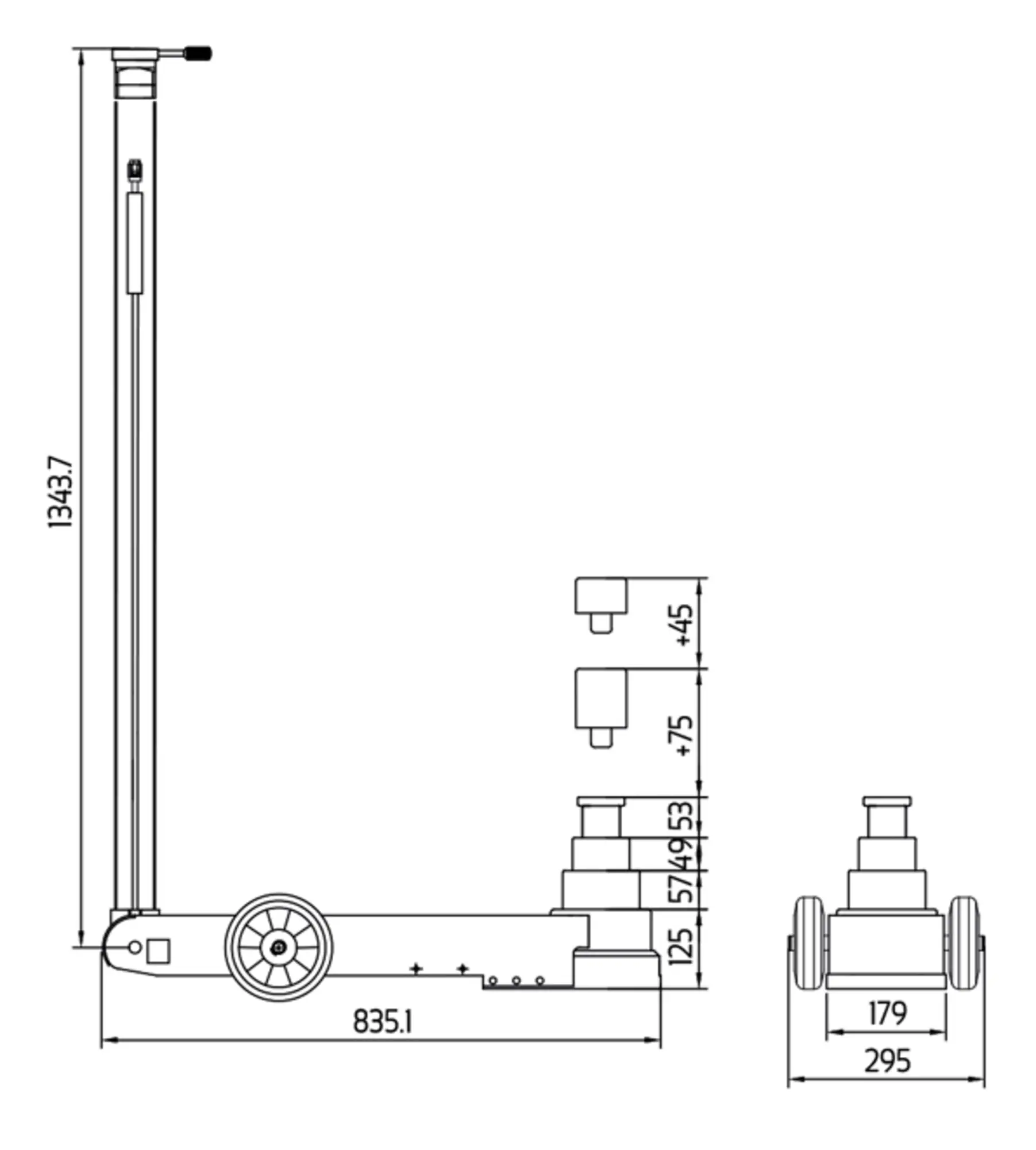 Cric rouleur hydropneumatique Capacité : 40 T. 1er piston / 20 T. 2eme piston / 10 T. 3eme piston.