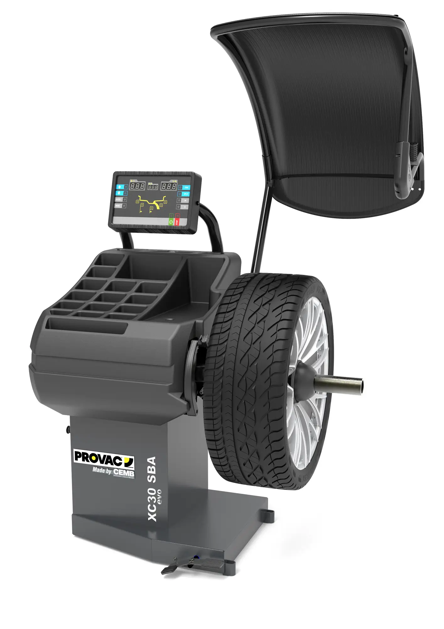 L’équilibreuse XC30EVOSBA est un modèle automatique avec carter et blocage automatique des roues à centre ouvert conçu pour un usage intensif en atelier. Elle est équipée d’un sonar virtuel, permettant la mesure automatique de la largeur des roues avec jante en acier, pour un réglage rapide et précis.