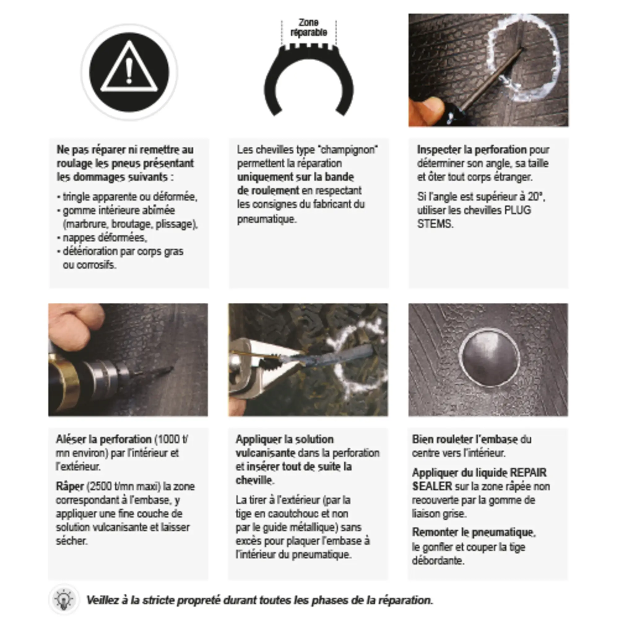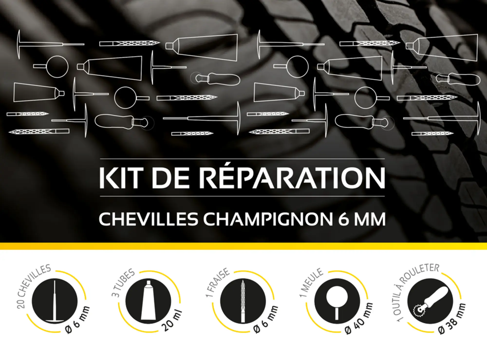 Ce kit de réparation comprend : - x20 chevilles avec tige Ø 6mm (réf. 94341)- x3 tubes de solution vulcanisante 20ml - x1 fraise en carbure de tungst