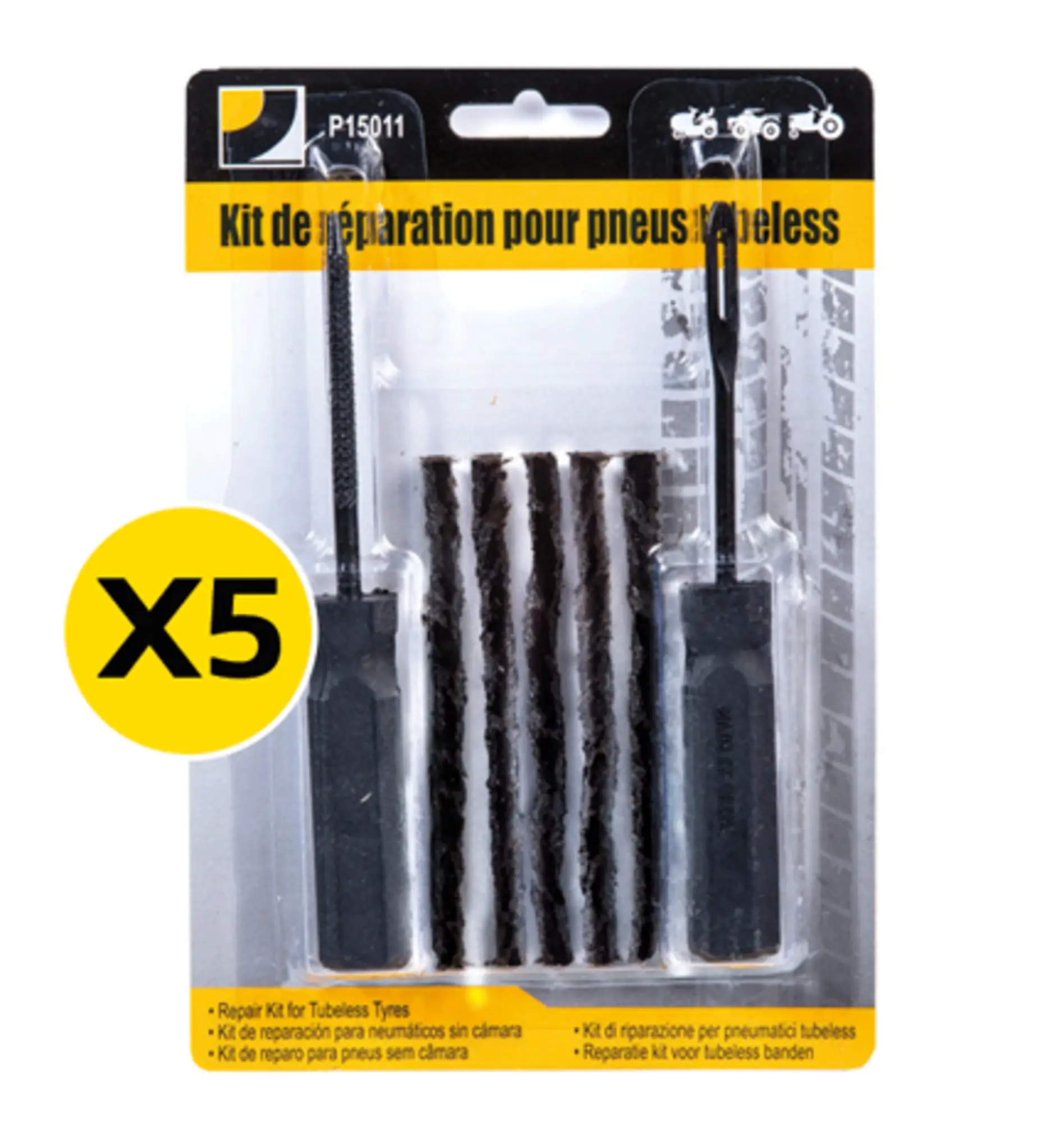 Ce lot de 5 kits de réparation est parfait pour traiter rapidement les perforations des pneumatiques !