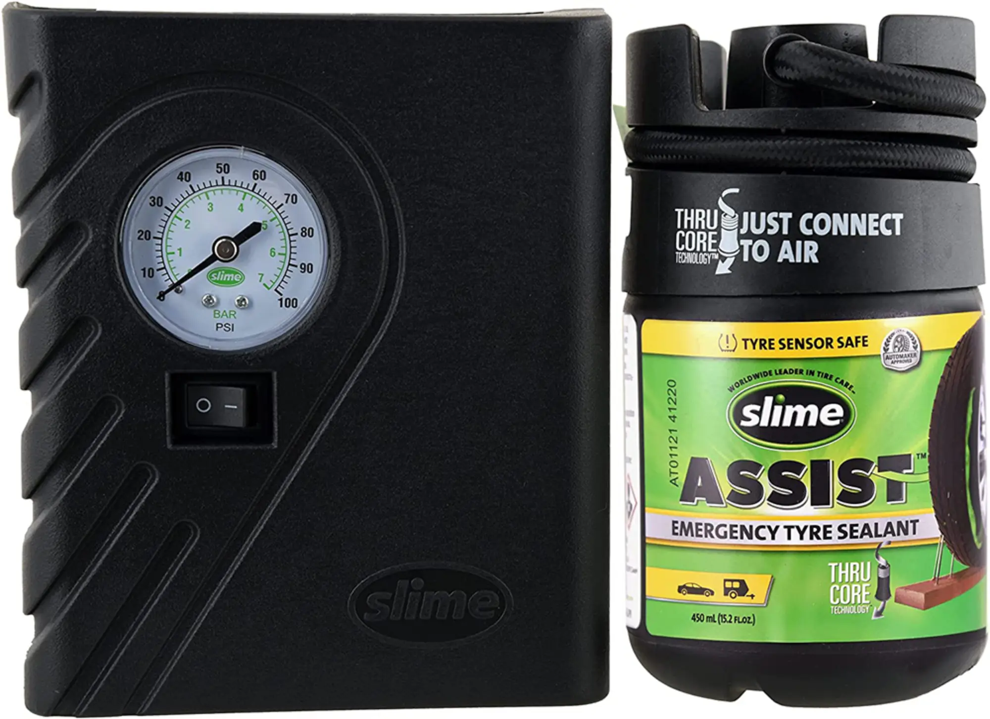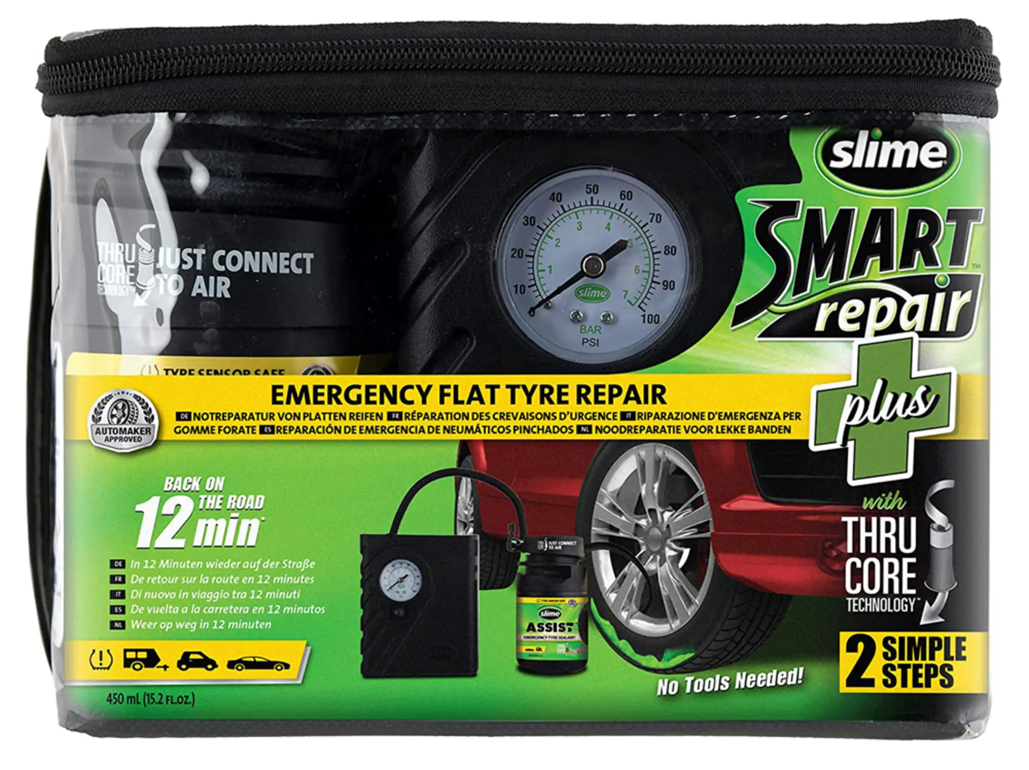 Ce kit comprend un gel auto-réparant à base de latex et un compresseur d'air 12V, conçu pour se brancher directement sur l'allume-cigare du véhicule, offrant une solution pratique et efficace pour les urgences sur la route.