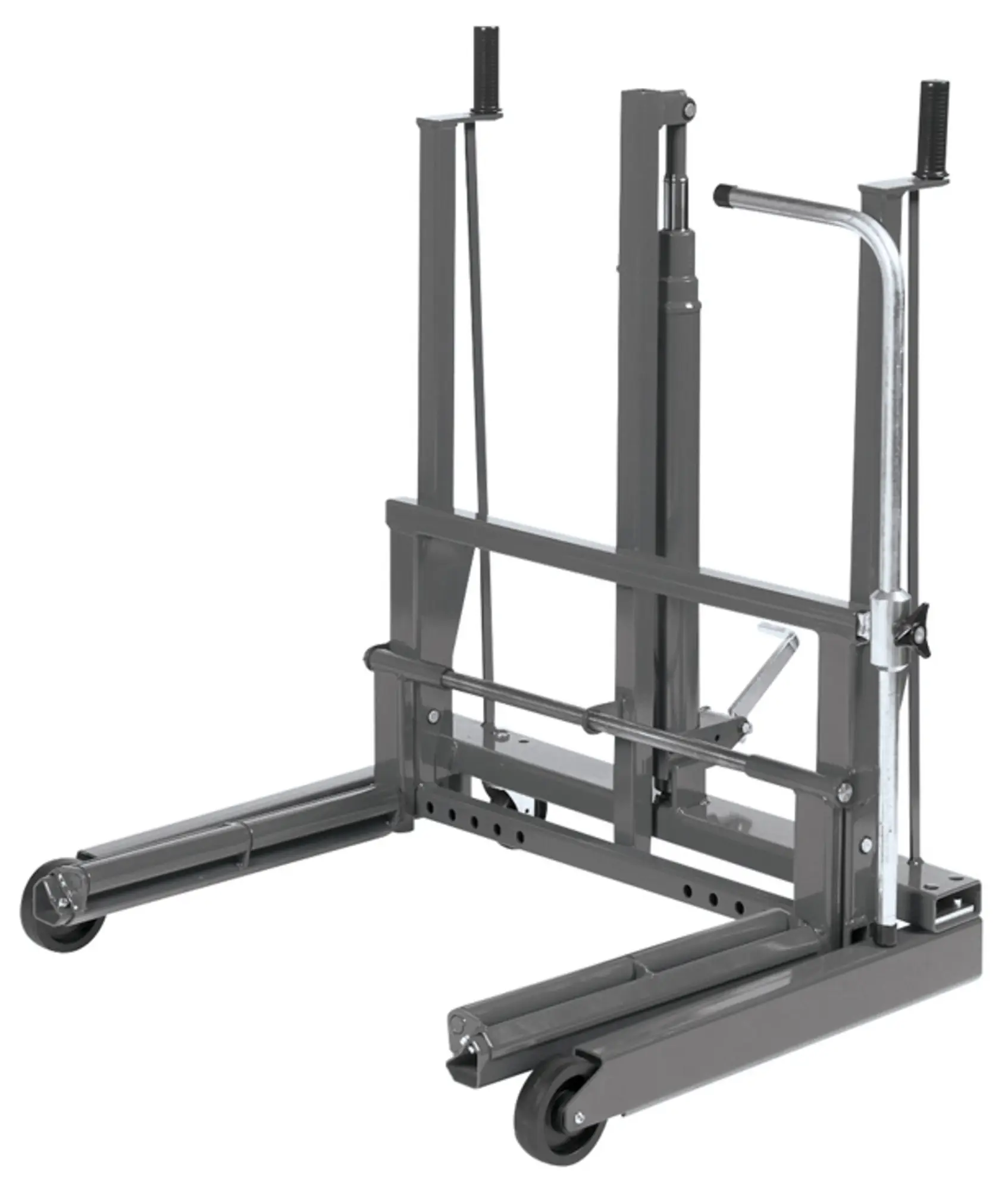 Lève-roue à fonctionnement hydraulique. - Capacité : 500 kg.- Hauteur minimum : 106 mm.- Hauteur maximum : 717 mm.- Distance entre rouleaux 260 à 710