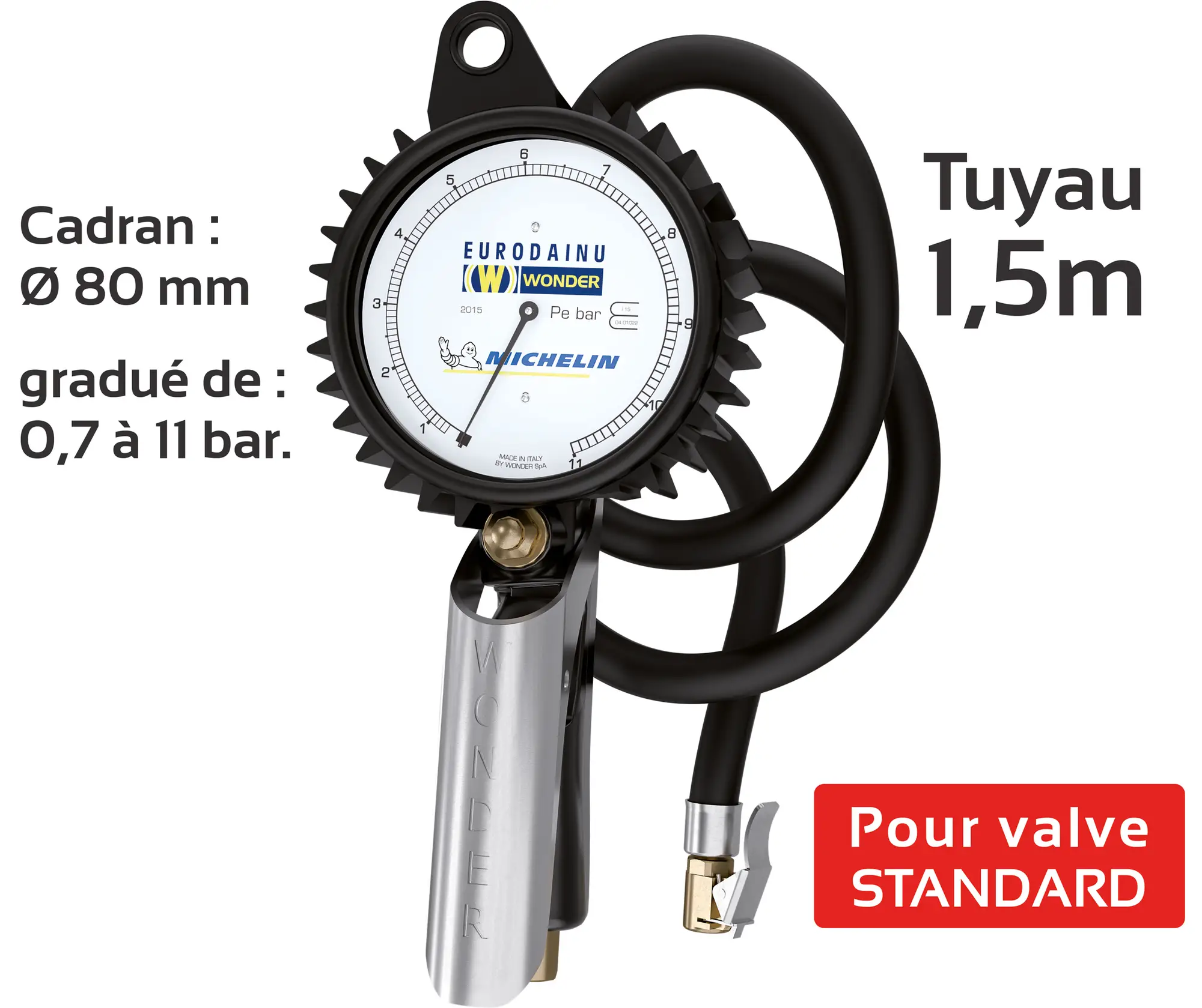 - Diamètre du cadran : 80 mm, gradué de 0,7 à 11 bar. Admission taraudée 1/4".