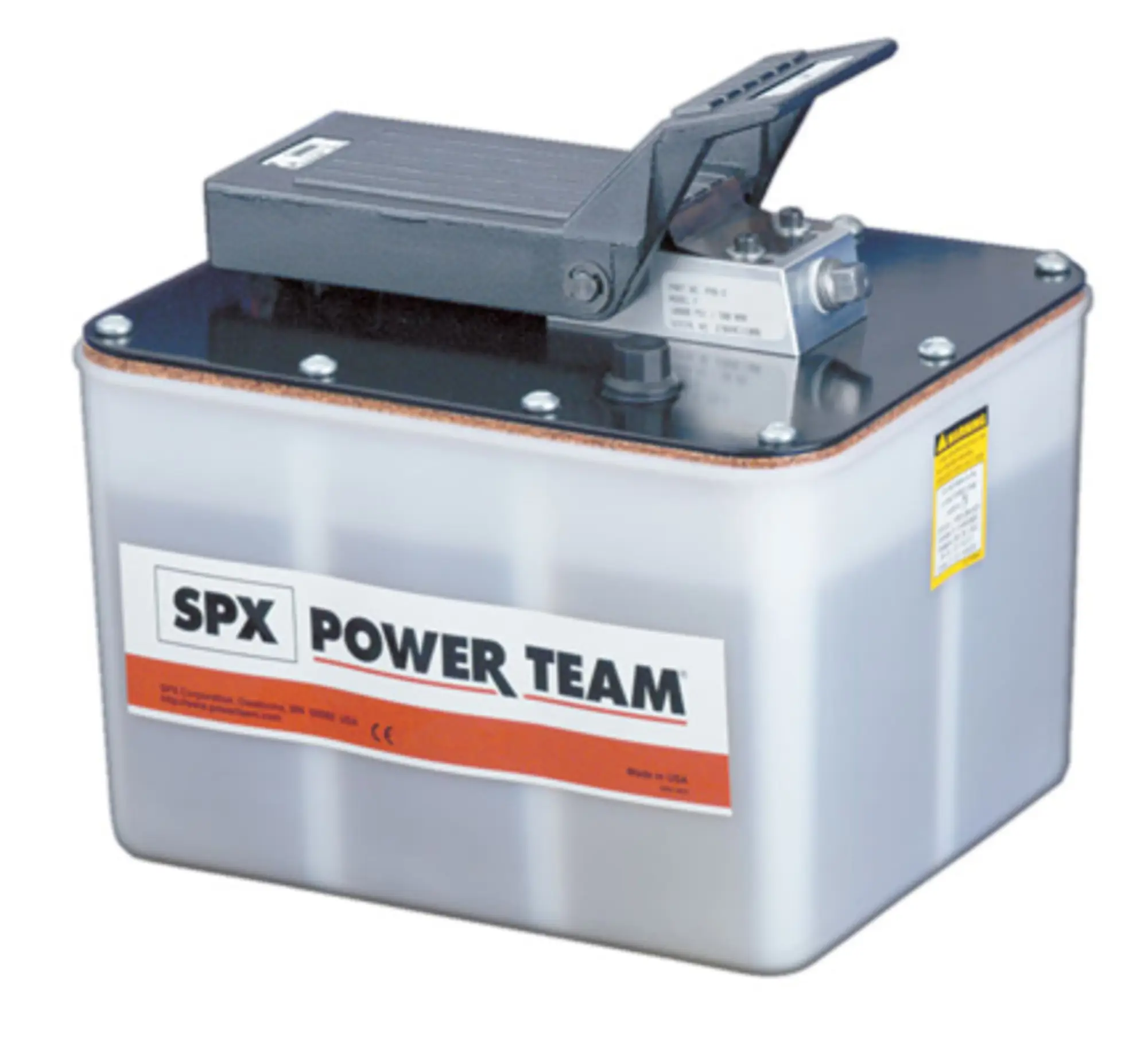Pompe hydro-pneumatique commandée au pied. Équipée d'une soupape de sécurité. Poids : 11 kg. A alimenter avec de l'air comprimé (7 bar), filtré et lubrifié. Réservoir de 7 l en plastique antichoc.