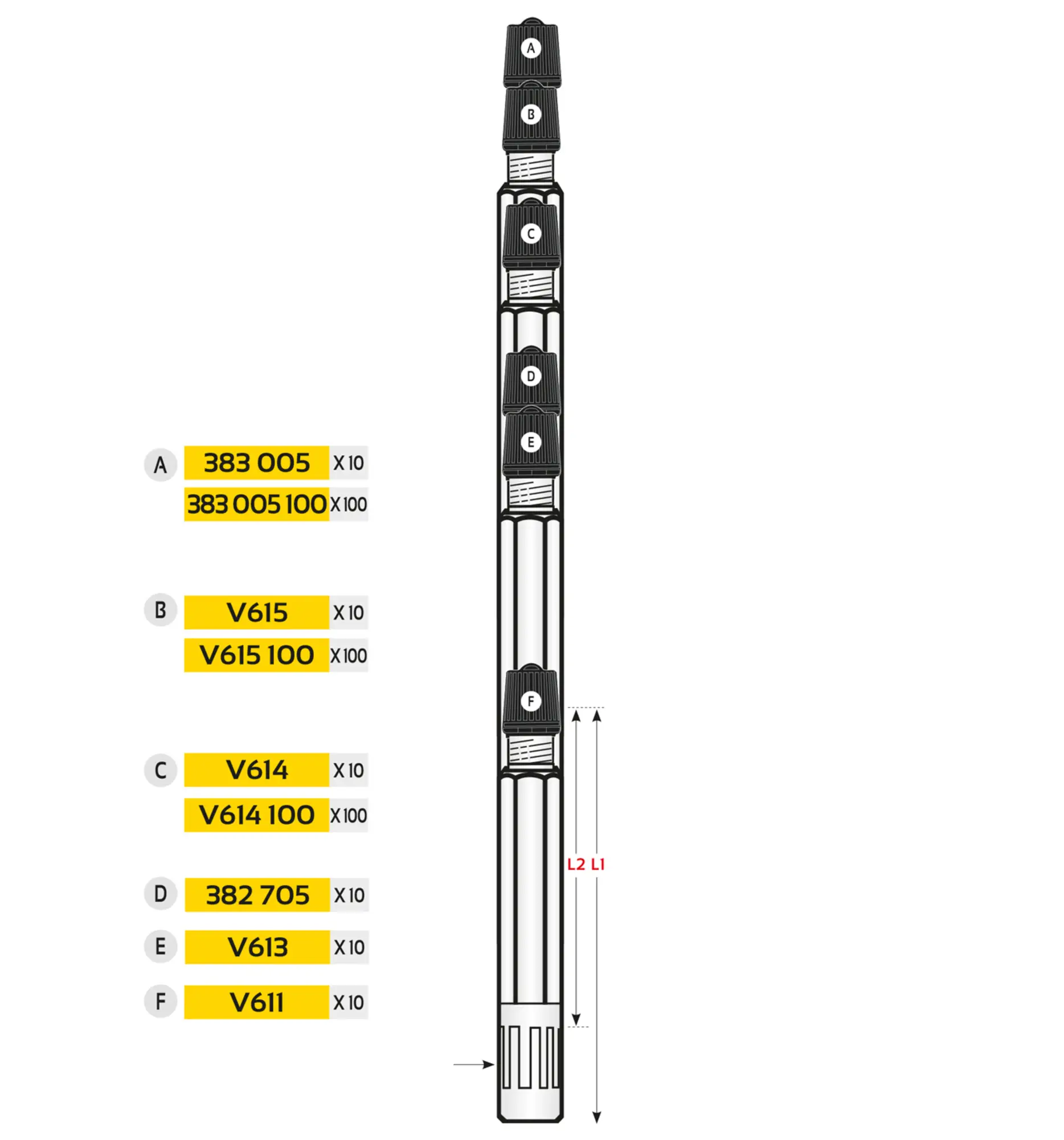 Rallonge de valve PL, Rigide (plastique).# - Longueur de la rallonge : L1:125mm, L2:107,5mm.