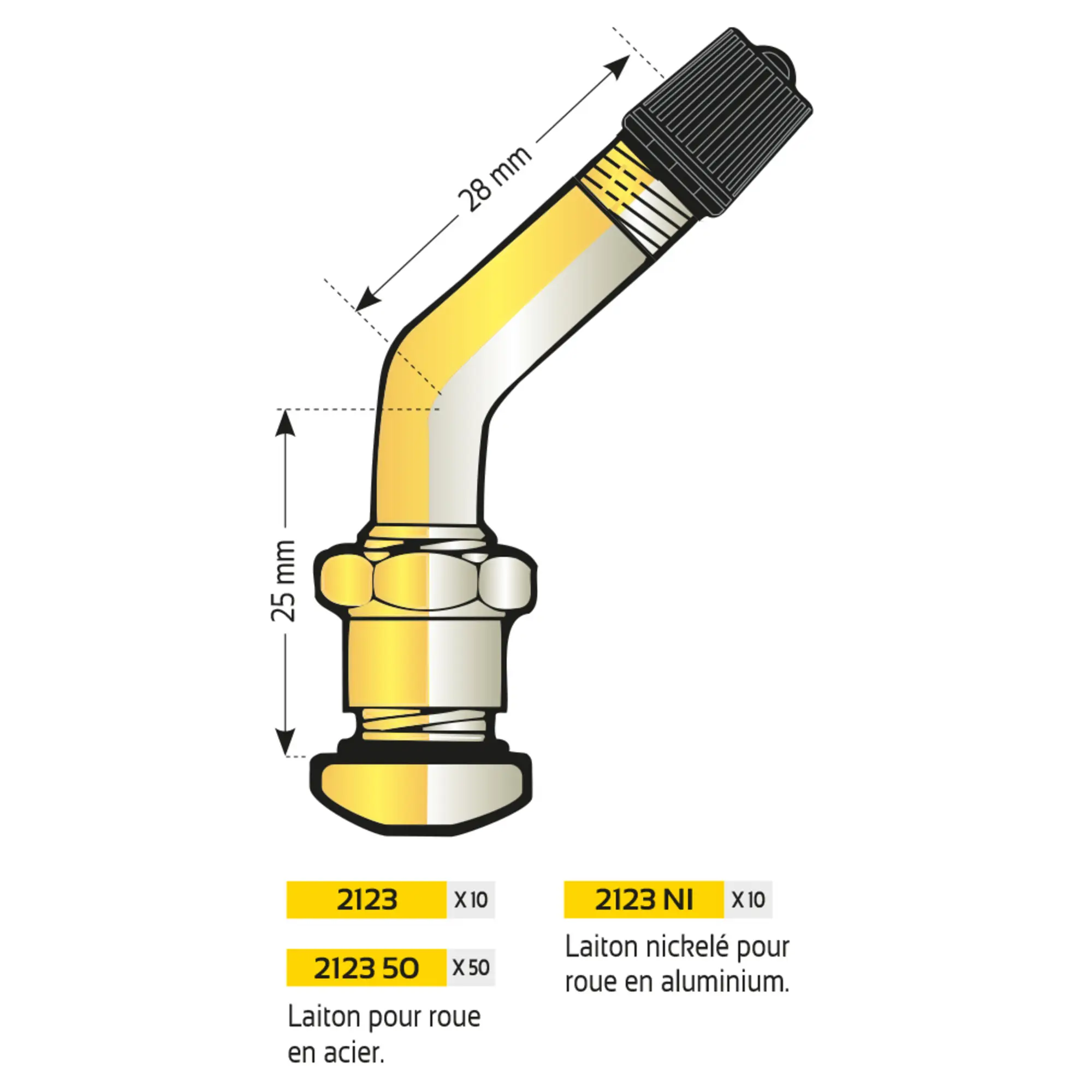 Valves en laiton pour roue en acier - 135°. Bouchon avec joint - Couple de serrage : 12 à 15 Nm.
