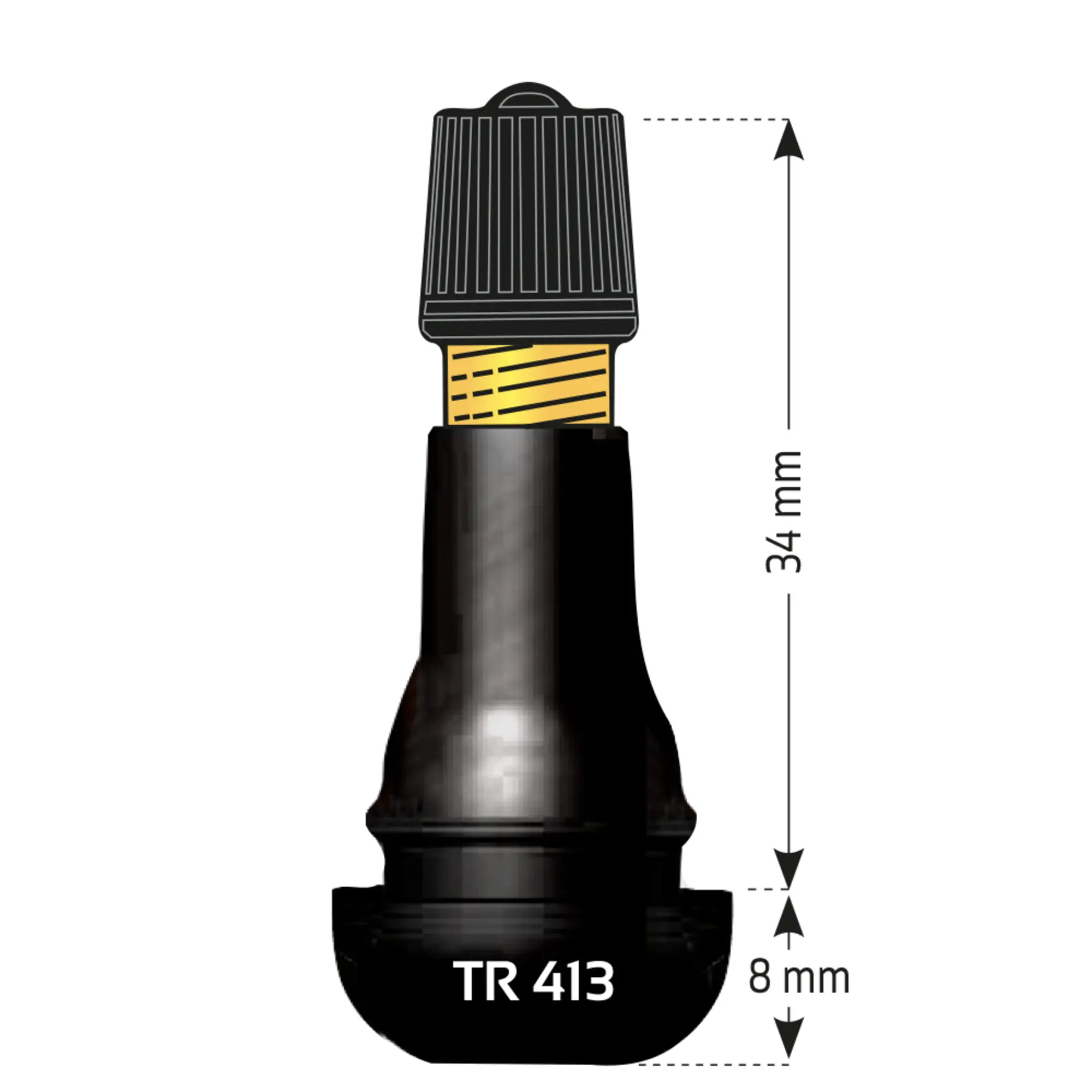 Les valves caoutchoutées TR413 sont conçues pour les pneus sans chambre montés sur des jantes dont l’épaisseur se situe entre 1,8 mm et 4 mm. (pour les jantes plus épaisses, il est recommandé d’utiliser une valve métallique).