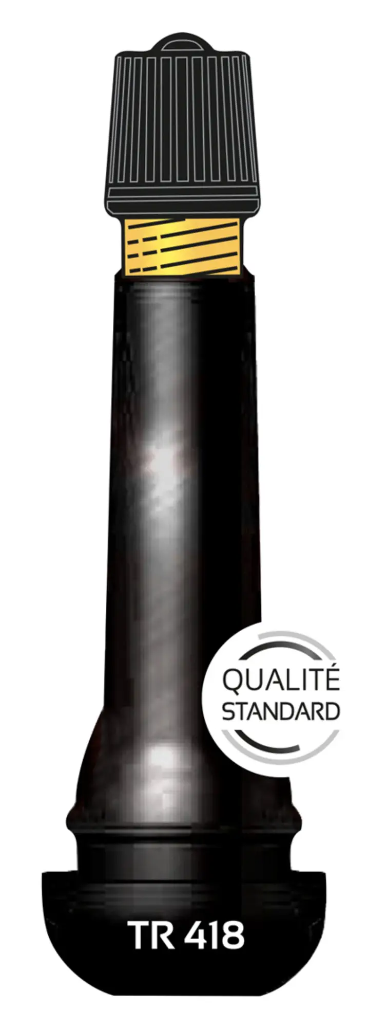 Valves caoutchoutées TR 418 pour pneus sans chambre. - Qualité standard. - Longueur : 61 mm / Diamètre : 11,5 mm. - Pression de gonflage maxi : 4,5 bar. - Il est conseillé de remplacer la valve à chaque changement de pneumatique.