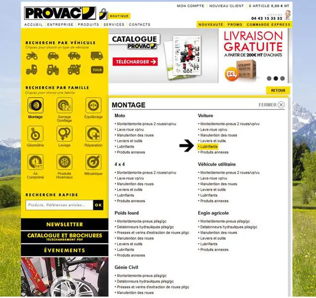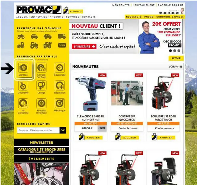 1.Sélectionnez la FAMILLE qui vous intéresse : Montage, Serrage-Gonflage, Équilibrage, Géométrie, Levage, Réparation, Air Comprimé, Produits Hivernaux, Mécanique.